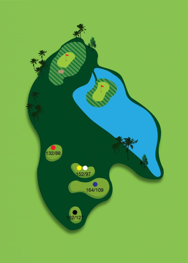 골퍼는 장단점이 있는 2개의 그린 중 하나를 선택할 수 있으므로 선택의 여지가 있습니다. 고지대를 선택하면 미드아이언에서 매우 어려운 그린까지 도달하게 되며 약한 타격은 딥 팟 벙커를 찾거나 더 심한 경우 언덕 아래로 굴러 내려가 깃발을 향한 까다로운 피치 샷을 남기게 됩니다. 언덕의 바닥. 낮은 도로를 선택하면 목표가 좁은 섬 그린이지만 샷은 내리막으로 플레이되고 50야드 더 가깝지만 이 그린을 놓치면 티에서 3번 플레이하게 됩니다.